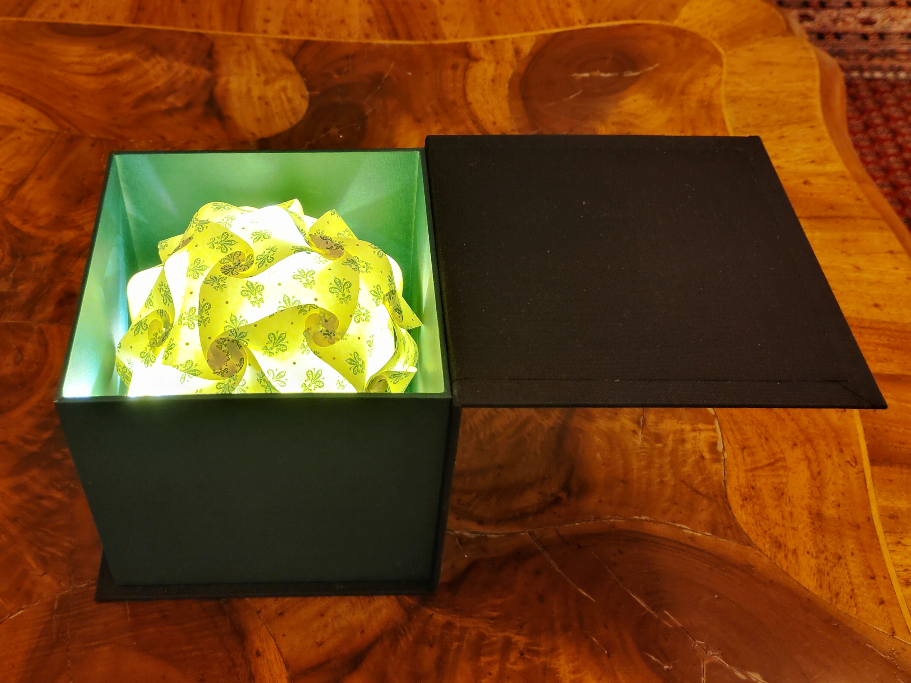 Gemeinsam mit Birgit Sargant, die wunderschöne Lampen und Leuchtobjekte fertigt, haben wir die Kombination von Lichtkugel in der Geschenkbox entwickelt.